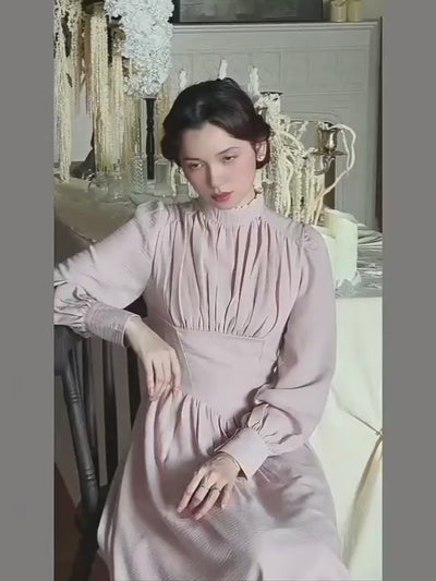 Crafted from soft, flowy fabric in a gentle blush hue, this dress features a romantic high neckline with delicate pleats that cascade beautifully down the bodice.