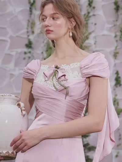 The bodice features gathered draping that wraps the waist softly, creating a naturally flattering line. A panel of floral lace decorates the neckline, adorned with a ribbon bow and a small rose detail — reminiscent of vintage hand-tied corsages. The sleeves are lightly puffed with cascading fabric along the back, adding movement and a romantic, painterly silhouette.