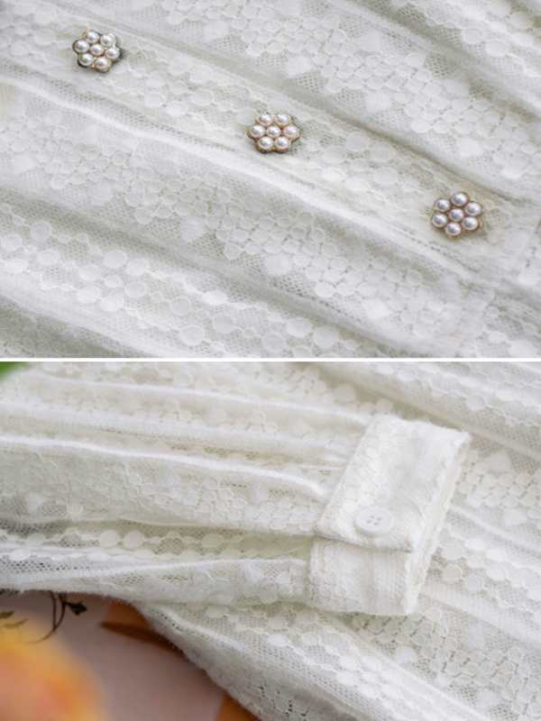 Invited to a garden party, she was wearing a soft white lace dress. A detachable burgundy ribbon and a pearl buckle adorned her chest, adding a touch of luxury, while the voluminous A-line skirt accentuated her elegance.