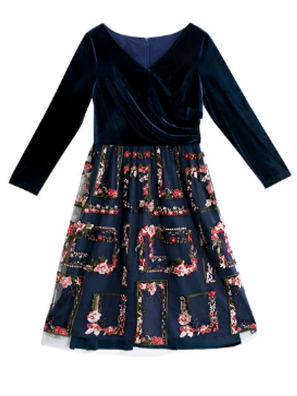 She was holding a violin. The retro navy dress wrapped her body beautifully. The V-neck design quietly revealed her neck line, and the velvet material shone softly in the light, emphasizing her elegance. The skirt was embossed with elegant floral designs, which swayed slightly as she moved, exuding a sophisticated charm.