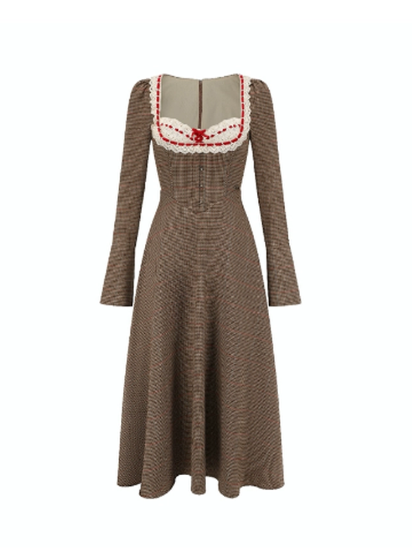 She was sitting on an antique chair in the living room, flaunting her French retro dress in brown check as if time had stopped. The square neckline wrapped her delicate neck, and the carefully decorated white lace and red ribbon on her bust made her femininity shine even more.