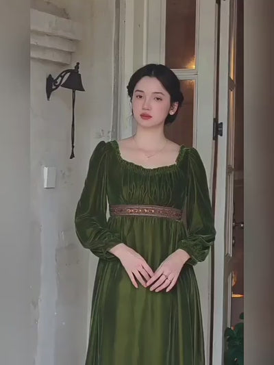 Step into an era of quiet elegance with the Emerald Velvet Renaissance Dress.