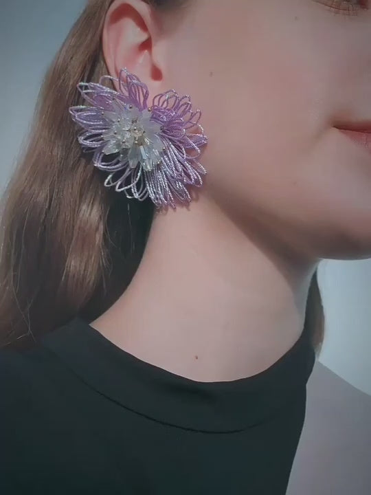 Handcrafted from shimmering silk thread and crystals with a 925 silver pin, each earring unfolds like a delicate flower bathed in morning light.