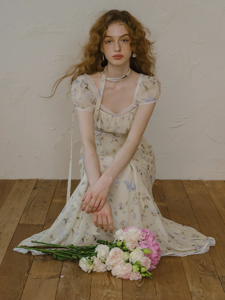 She stood, holding a bouquet of flowers, as if dancing. The sweet floral print summer dress, adorned with ivory and blue flowers, made her stand out beautifully. The square neck and short sleeves added a touch of summer freshness, while the white lace on the waist and hem brought purity and elegance. The long skirt, made from a fluttery material, swayed with the wind, creating an illusion of her dancing lightly through a flower garden. This summer dress gifted her a perfect fairy-tale moment.