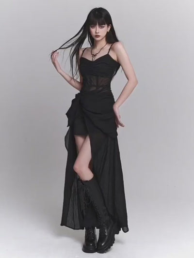 Slip into a darker kind of romance with our Midnight Siren. This black maxi dress sculpts the figure with a corset-inspired bodice and ruched sweetheart bust, then releases into a weightless, crinkled-mesh overlay that knots at the hip and opens to a dramatic front slit. The sheer skirt floats over a mini underlayer, so every step shows a hint of leg while keeping the silhouette refined. Slender straps, a secure back zip and a fluid hem create that midnight-muse movement—equally perfect with lace-up boots for concerts or strappy heels for evening plans. A signature piece for dark-feminine, gothic romance and modern party looks, designed to make an entrance and linger in memory.