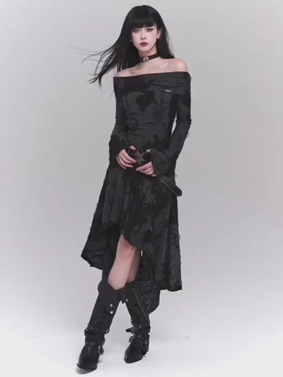 Step into a darkly romantic fairytale with this gothic-inspired black dress. Crafted from a textured blend of polyester and viscose, it features a unique distressed velvet finish that adds depth and mystery. The elegant off-shoulder neckline frames the collarbone beautifully, while the long sleeves and asymmetrical handkerchief hemline create a dramatic silhouette. Perfect for vintage-inspired wardrobes with a gothic twist, this dress transitions seamlessly from daydreaming in secret gardens to nighttime soirées.