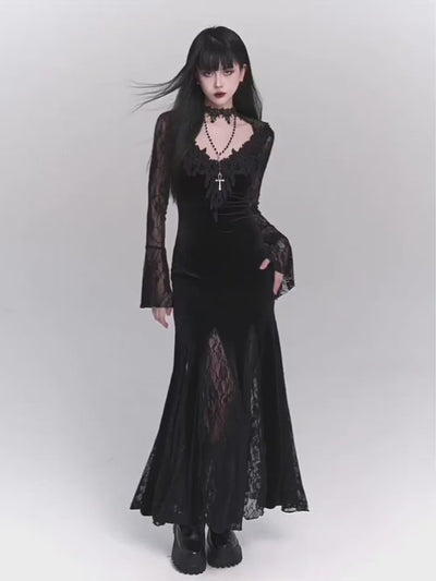 Slip into a little dark romance. Our Nocturne Velvet & Lace Siren Gown from Romantic Fairytale blends inky sheer lace with plush, light-catching velvet to trace your shape and then spill into a sweeping mermaid hem. The scalloped lace neckline frames the décolletage, while bell sleeves and lace godet inserts add movement with every step—dramatic yet refined, like a midnight waltz.