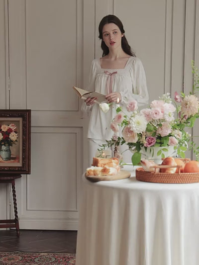 Wrap yourself in a dreamy cottagecore mood with the Pink Ribbon Cotton Loungewear Set. Made from a soft blend of 96% cotton and 4% spandex, this two-piece loungewear features a romantic square neckline trimmed with lace, puffed long sleeves, and a delicate pink ribbon bow at the chest. The matching pants have ruffled hems, completing the fairytale-inspired silhouette. Designed for women who love fairycore and princesscore aesthetics, this outfit makes every morning feel like a gentle storybook scene. Perfect for cozy autumn mornings, relaxing afternoons, or a serene night at home.
