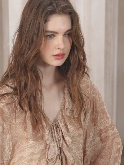 Step into a world of timeless romance with this beige lace-patterned blouse and flowing skirt set. The blouse features delicate ruffle details and soft ties at the neckline, paired with billowing sleeves for an effortlessly feminine silhouette. The matching tiered skirt moves gracefully with every step, its lace-inspired print adding layers of vintage charm.