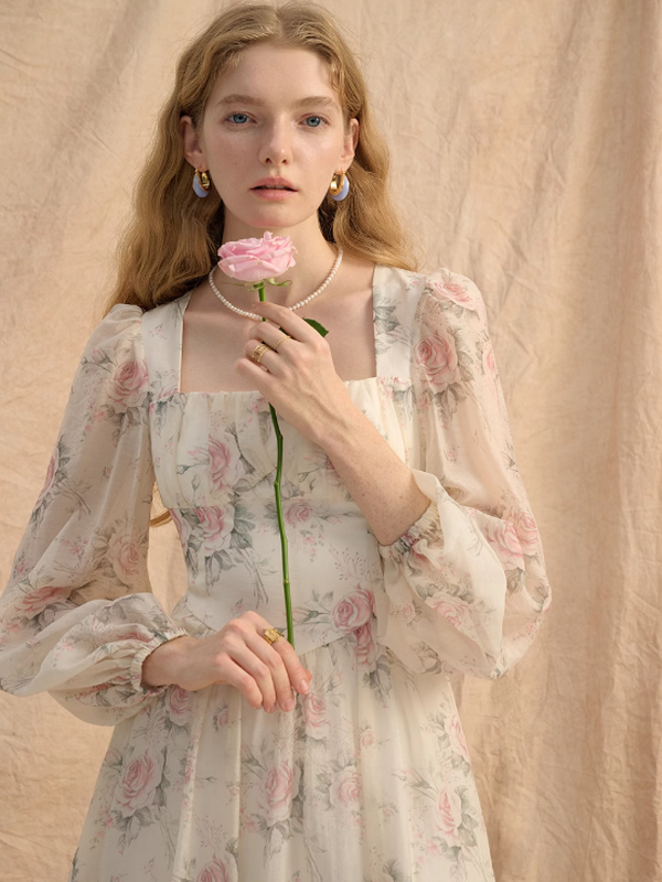 Dressed in a long dress with a white background and elegantly drawn pink rose prints, she looked like a princess one might see in a dream. The dress, made of soft cotton fabric, with a square neck and high waist design, further emphasized her elegance. The rose she was holding blended with the print of the dress, elevating the romantic atmosphere even more.