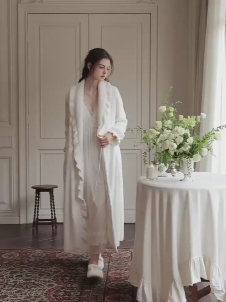 Made from luxuriously soft fabric, this robe features cascading ruffle trim along the neckline and cuffs, creating a dreamy silhouette that evokes vintage, cottagecore, and princesscore aesthetics. The belted waist offers a flattering fit while keeping you wrapped in cozy warmth, making it perfect for layering over your favorite nightgown or enjoying quiet mornings at home. A piece designed to turn your everyday routine into a fairytale moment.
