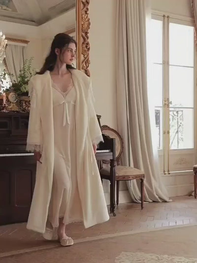 Wrap yourself in a soft, fairytale-like warmth with this romantic hooded robe. Designed with delicate lace trim along the collar and sleeves, it captures a vintage elegance reminiscent of quiet mornings in a rose-lit parlor. The long silhouette drapes gracefully, while the adjustable waist tie creates a gentle, feminine shape.
