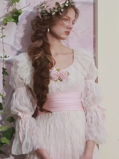 This dress brings to life the poetic elegance of a quiet spring garden. Crafted with a cloud-soft, crinkled chiffon texture, it floats with every step—light, airy, and effortlessly graceful. The wide ribbon sash cinches the waist in a gentle silhouette, reminiscent of romantic portrait dresses from another era.