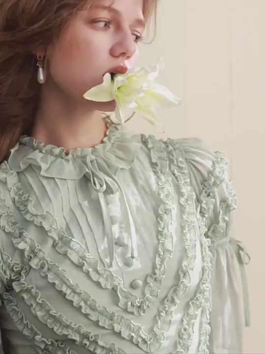 This dress is crafted in a soft, pale sage tone that feels like morning light filtered through leaves. Made from 100% cotton, it offers natural comfort and breathability while preserving an elegant, refined silhouette. The bodice features layered ruffle detailing arranged in gentle chevrons, creating a graceful Victorian-inspired texture that draws the eye with quiet sophistication.