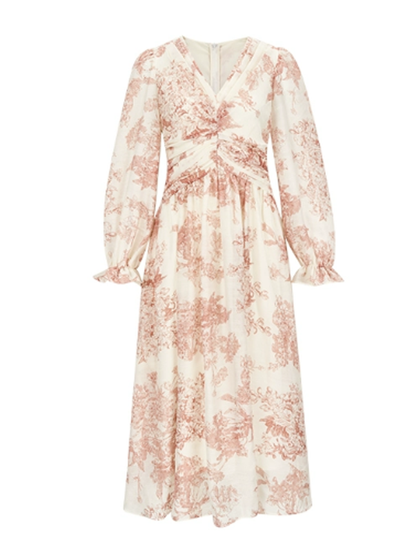 She is wearing a fall chiffon dress in ivory with light pink floral patterns. The organ pleats on the V-neck add a sophisticated femininity. The voluminous puff sleeves add a unique charm to the dress, and the strap on the back of the waist beautifully accentuates her silhouette. Under the autumn sun, she enjoys every moment with the dress.
