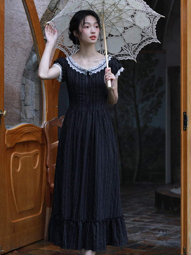 On a rainy day, standing at the gate with an umbrella and gazing up at the sky, she looked like a scene from an old movie. Victoria wore a retro-style black dress adorned with a lovely white lace and ribbon on the round neck. The subtle stripe pattern and high-waist design highlighted her elegance, while the frills of the long skirt fluttered with the wind, following her steps. Standing in the rain with her umbrella, Victoria savored the beauty and tranquility of nature, fully immersing herself in the moment.