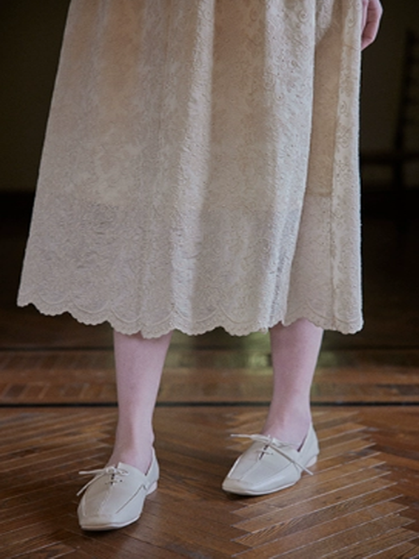 In her home, she stood waiting for someone, dressed in a French vintage-style flower embroidered dress. The dress, finished in a shiny beige, added a unique texture with its punching embroidery fabric. The V-neck and puff sleeves highlighted her elegance.