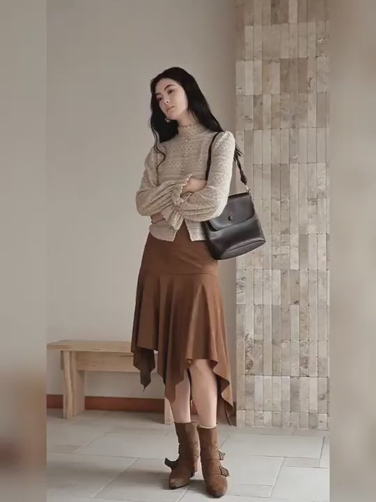This vintage-inspired cream knit blouse is designed with delicate lace-like patterns, soft puffed sleeves, and pearl button details for a truly romantic look. The high neckline and ruffled cuffs bring an elegant charm that blends effortlessly with cottagecore, fairycore, and vintage aesthetics. Made from a soft viscose blend with gentle stretch, this blouse offers both comfort and timeless style. Perfect for layering with skirts or styling as a dreamy everyday outfit.