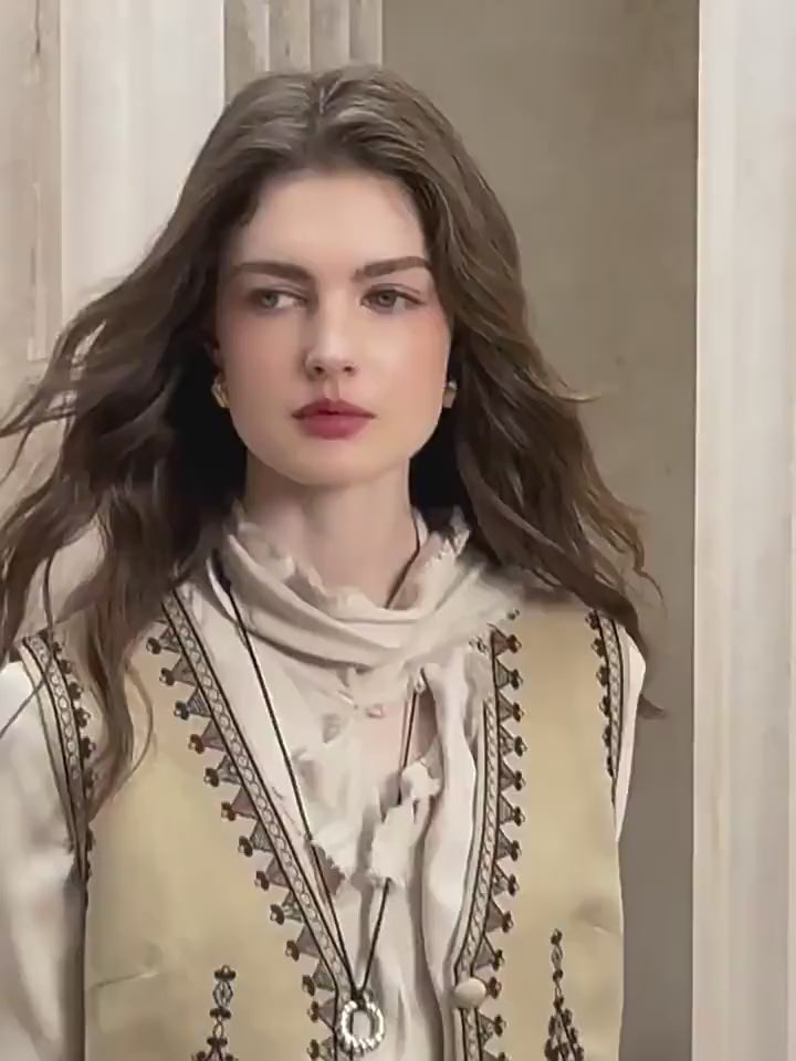 Step into a storybook moment with this vintage-inspired embroidered vest. Crafted from a soft linen blend (74% polyester, 9% rayon, 9% wool, 8% linen), it features intricate diamond embroidery in earthy tones that echo folk and fairytale aesthetics. The tailored cut and covered button closure make it perfect for layering over blouses or dresses, bringing a touch of cottagecore and boho charm to your everyday outfit. Pair it with wide-leg jeans for a casual countryside look or style it with a flowing dress for a romantic fairytale feel.