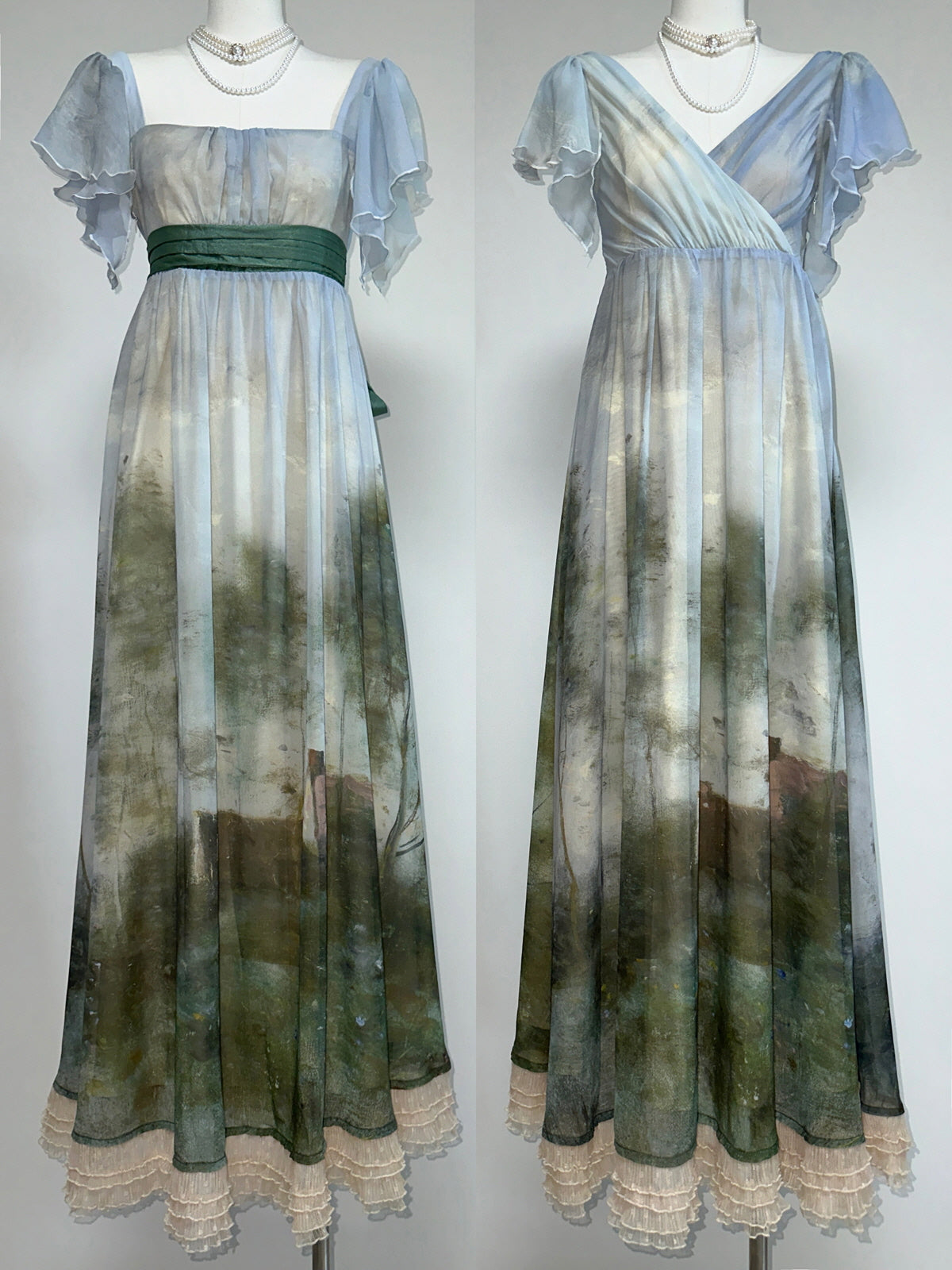 Crafted from high-quality polyester, the dress features delicate flutter sleeves and a gracefully flowing skirt, adorned with a serene, painterly landscape that wraps around the entire dress. The dress cinches at the waist with a wide, satin-like ribbon in a complementary deep green shade, accentuating the silhouette while adding a romantic touch. The back of the gown reveals a gently draped V-back design, tied off with a luxurious bow, creating a captivating and graceful exit.