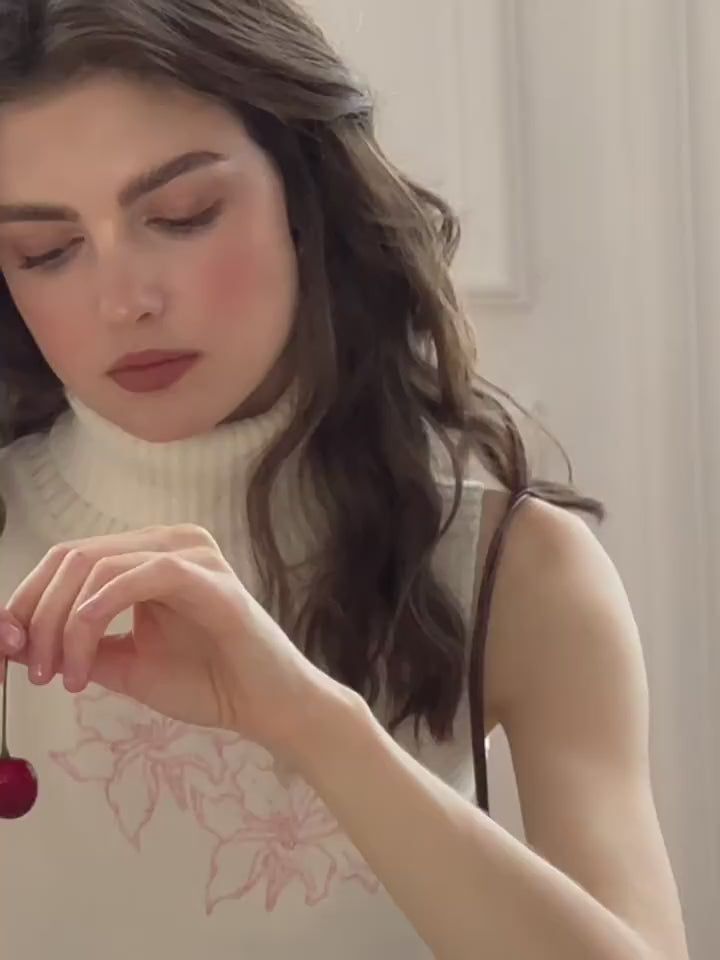 This sleeveless knit top blends cozy elegance with a touch of romance. Made from a premium blend of 30% acrylic, 40% nylon, 24% polyester, and 6% merino wool, it offers both softness and durability. The high turtleneck design creates a refined silhouette, while delicate pink floral embroidery adds a subtle feminine charm. Perfect for layering with skirts or cardigans, this versatile piece complements cottagecore, vintage, and romantic fairytale-inspired wardrobes. Ideal for transitional seasons, it brings warmth and sophistication to your everyday outfit.
